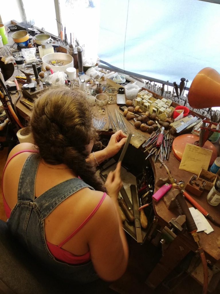 Charlotte’s story begins at a very young age in her grandfather’s workshop. She learned the basics side-by-side with him, polishing rings (she remembers being paid 50p a ring) and slowly taking on more complicated tasks as her interest grew.